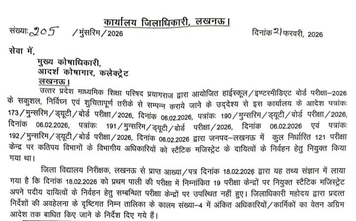 उत्तर प्रदेश में चल रही यूपी बोर्ड परीक्षा 2026 की शुचिता और पारदर्शिता को लेकर प्रशासन बेहद सख्त रुख अपनाए हुए है। परीक्षा केंद्रों पर नकल रोकने और व्यवस्थाओं को चाक-चौबंद रखने के लिए तैनात किए गए अधिकारियों पर अब गाज गिरनी शुरू हो गई है। ताजा मामला ड्यूटी में बड़ी लापरवाही का है, जहां निरीक्षण के दौरान एक-दो नहीं बल्कि पूरे 19 स्टैटिक मजिस्ट्रेट अपनी ड्यूटी से नदारत पाए गए।